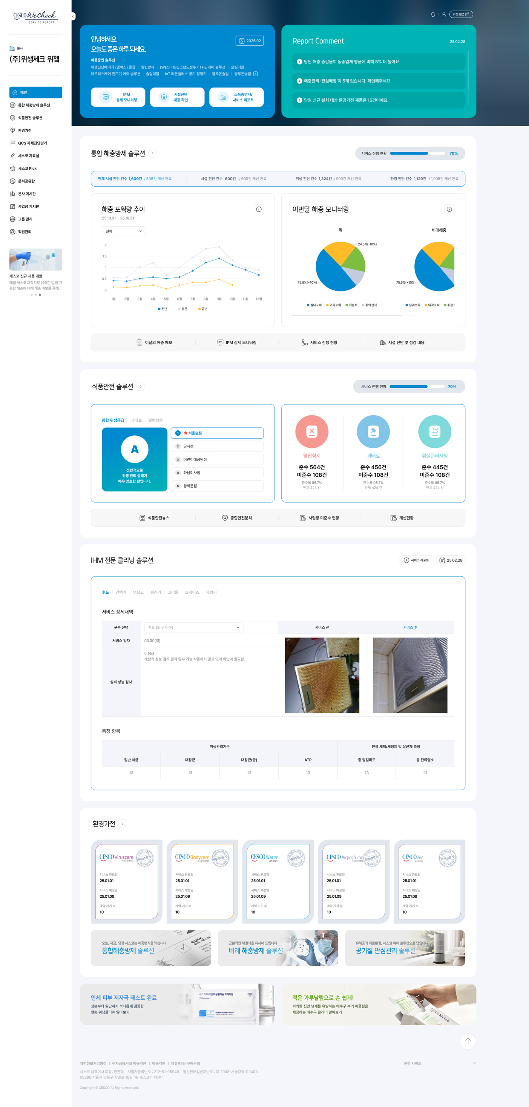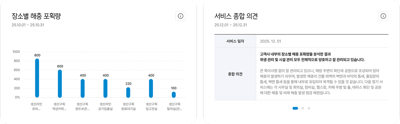 세스코 기준에 따라 진단된 사업장의 위생 정보를 그래프와 지표로 정리해 한눈에 보기 쉽도록 리포트 형태로 제공합니다.